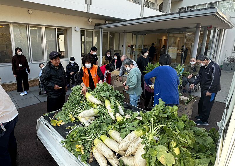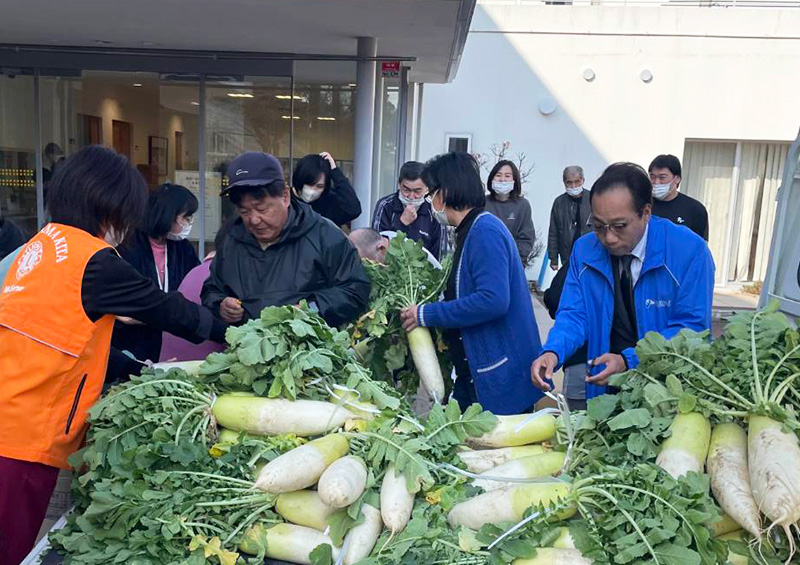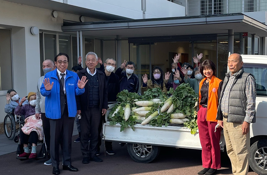 この度、松山市内の社会福祉法人松山隣保館 救護施設「丸山荘」様へ、自社農園「ウインファーム」にて栽培・収穫した大根150本を寄贈いたしました。